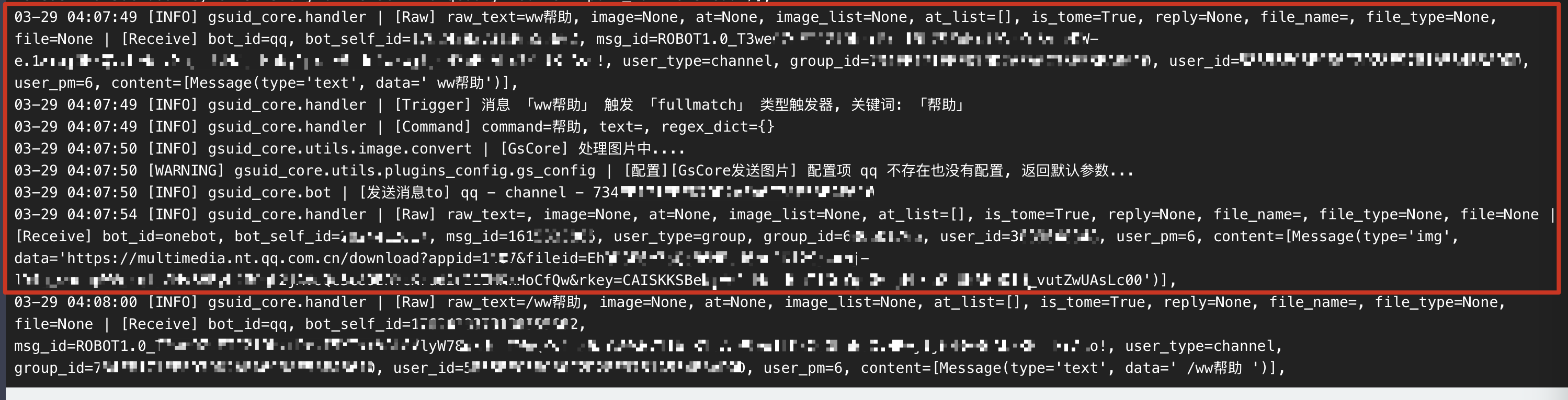 03-29 14:03:18 [INFO] gsuid_core.handler | [Raw] raw_text=ww帮助, image=None, at=None, image_list=None, at_list=[], is_tome=True, reply=None, file_name=, file_type=None, file=None | [Receive] bot_id=qq, bot_self_id=xx, msg_id=xx!, user_type=channel, group_id=xx, user_id=xx, user_pm=6, content=[Message(type='text', data=' ww帮助')],