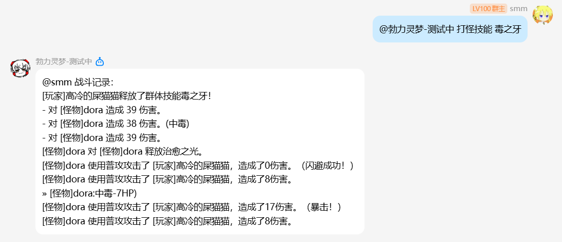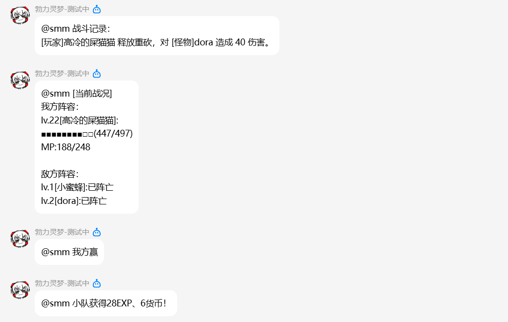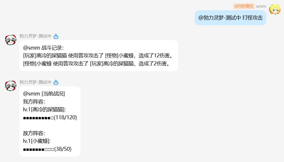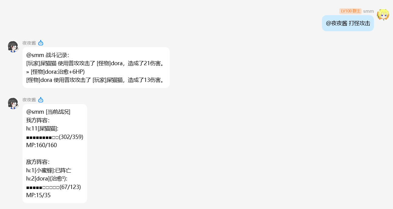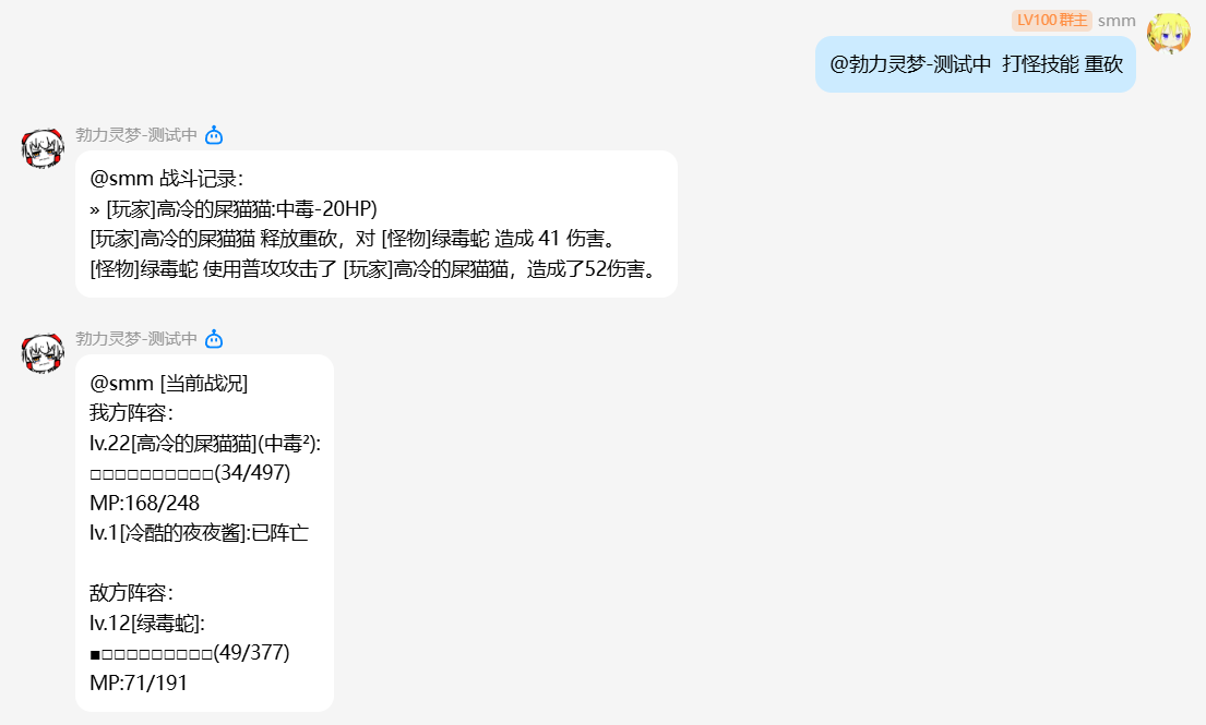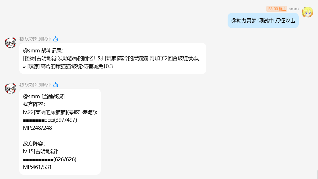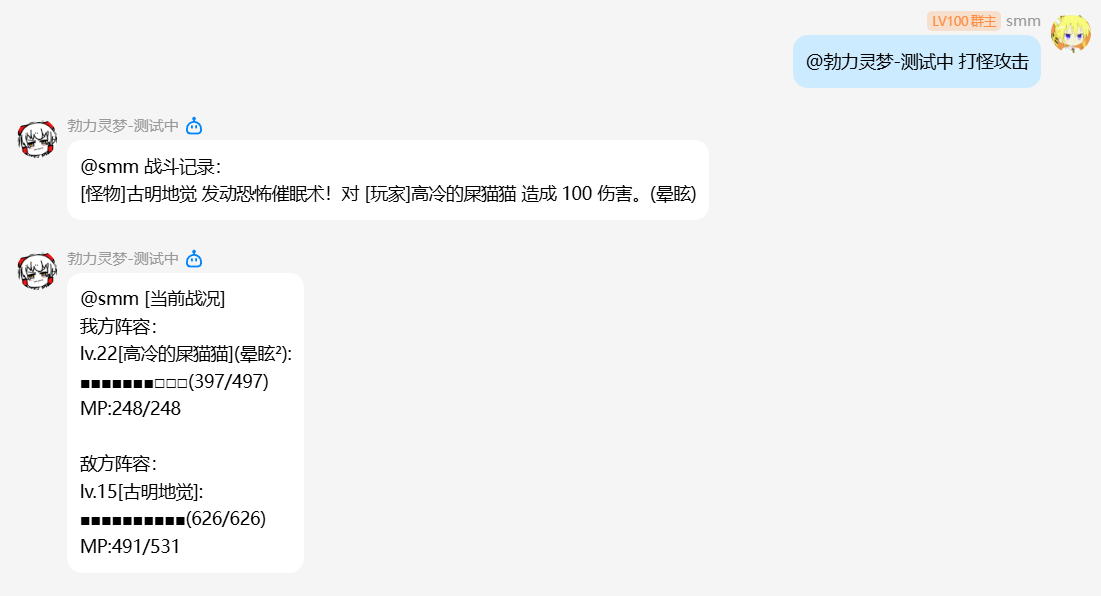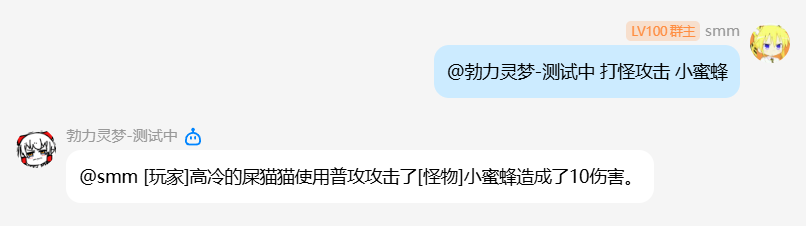 当地图中存在怪物时,可发送 /打怪遇敌 进行战斗,也可以指定单个 打怪遇敌 的对象