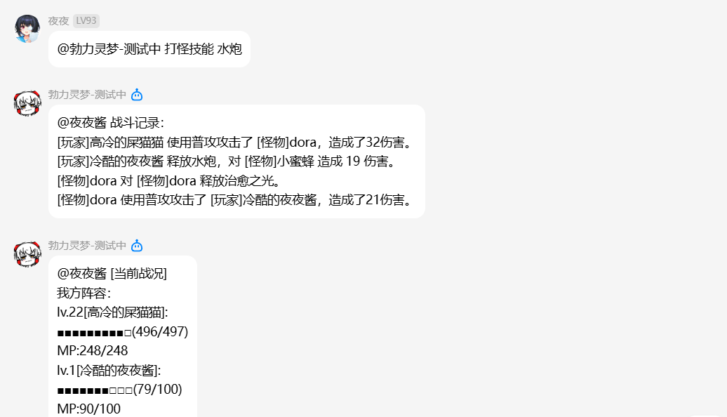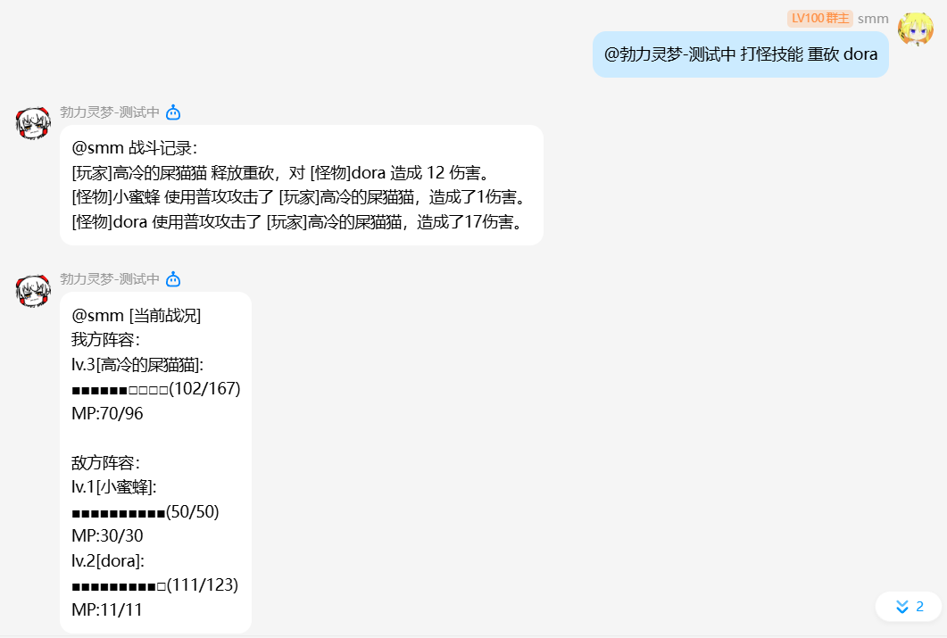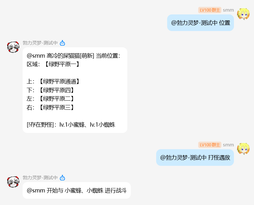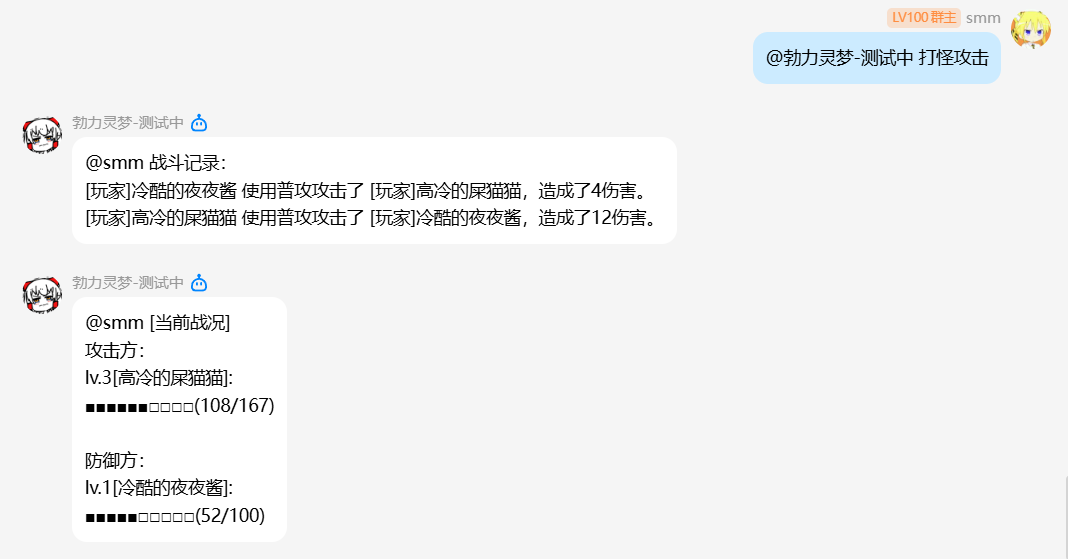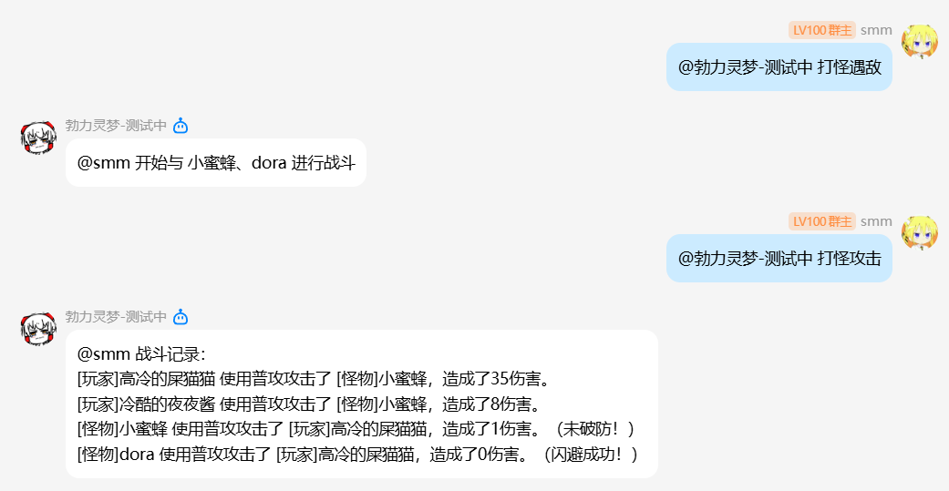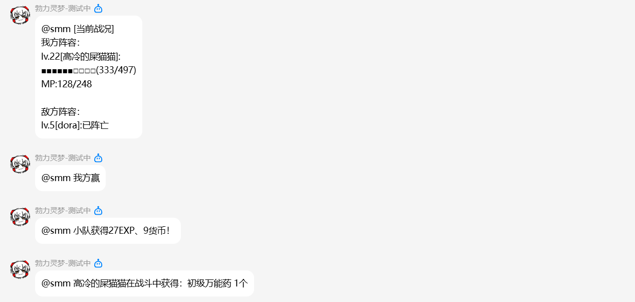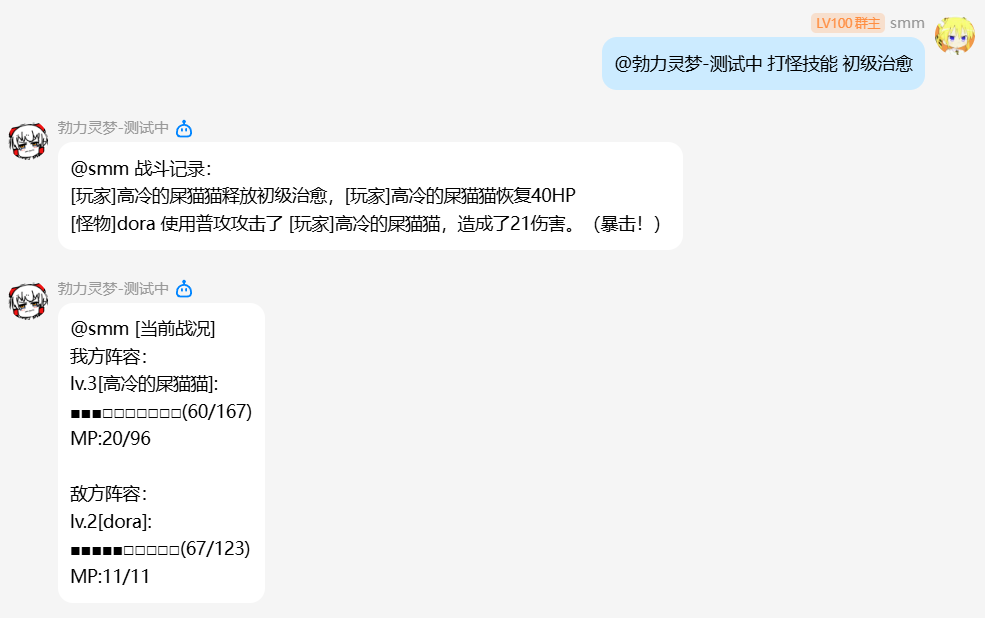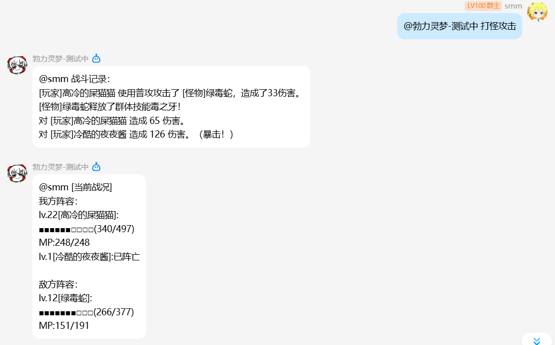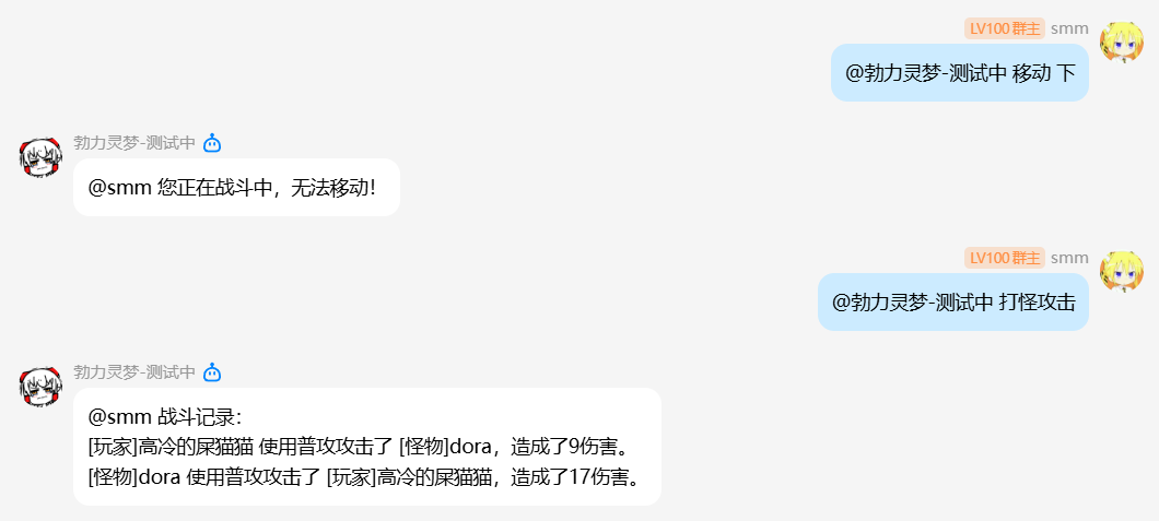 当地图中存在怪物时,可发送 /打怪遇敌 进行战斗,也可以指定单个 打怪遇敌 的对象