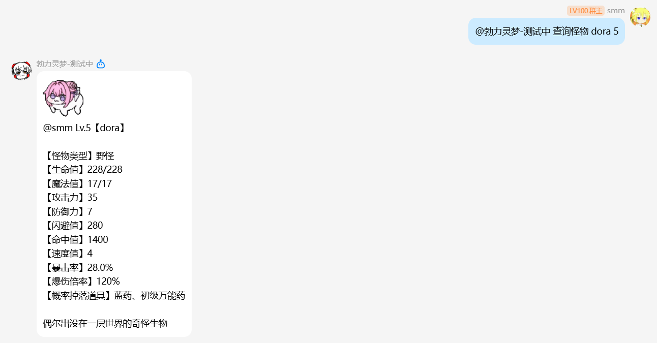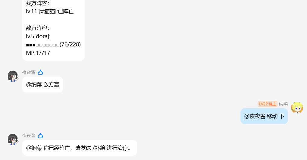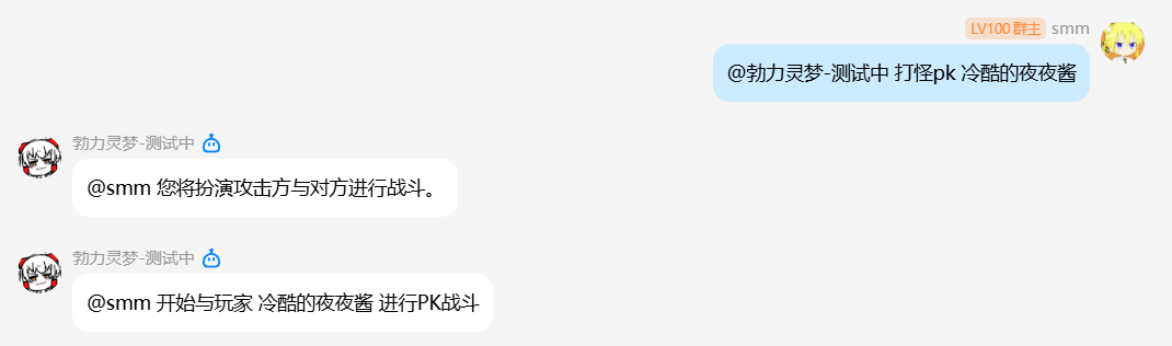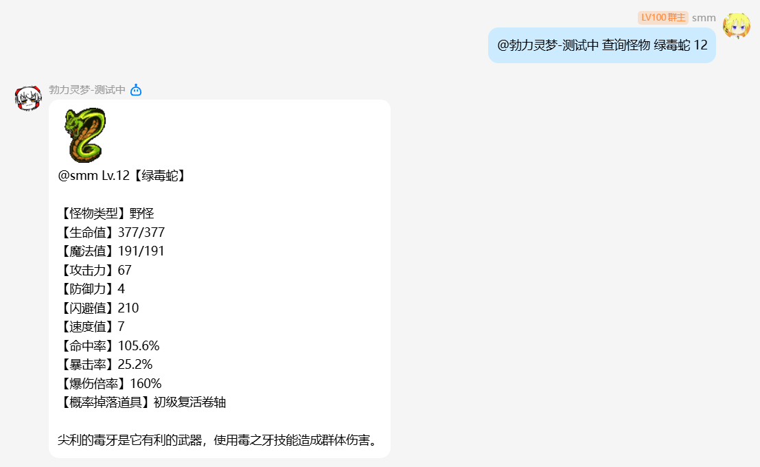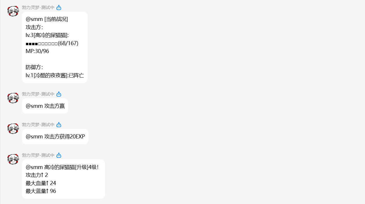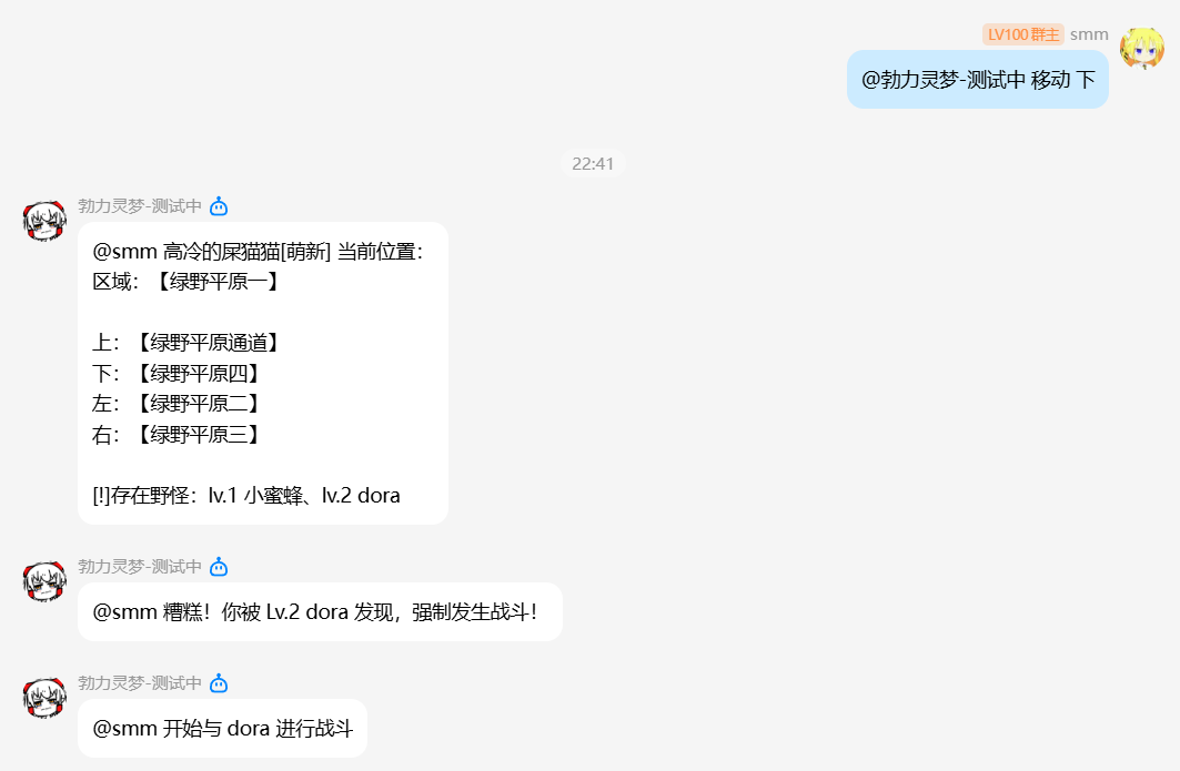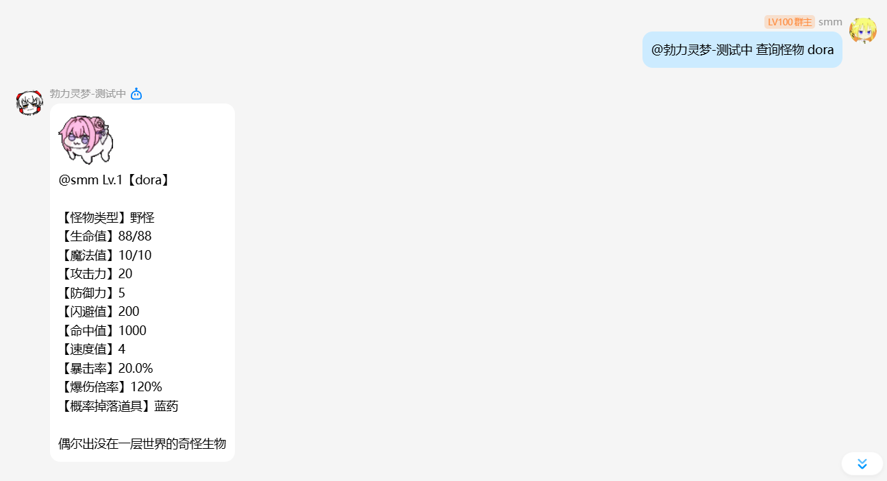 当地图中存在怪物时,可发送 /打怪遇敌 进行战斗,也可以指定单个 打怪遇敌 的对象