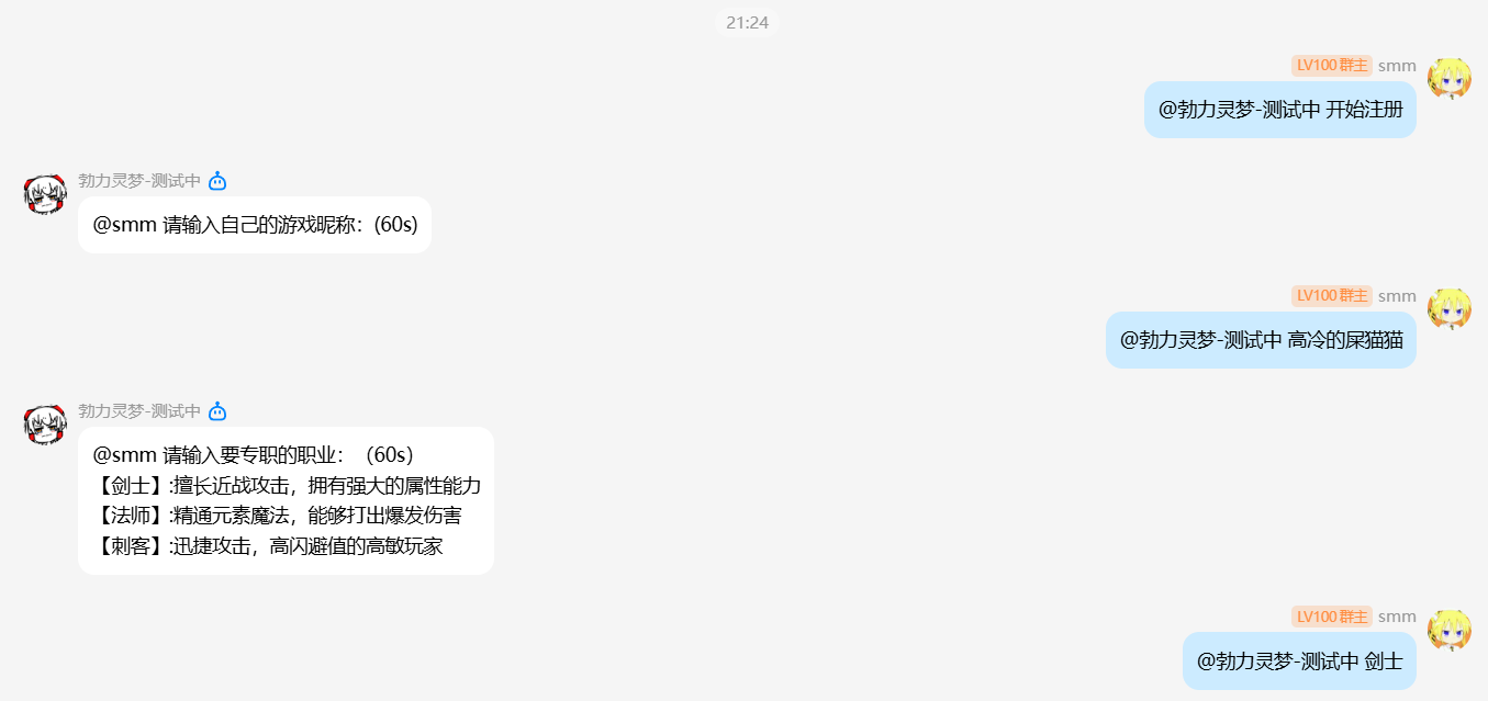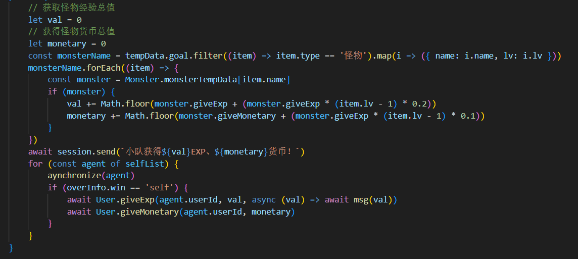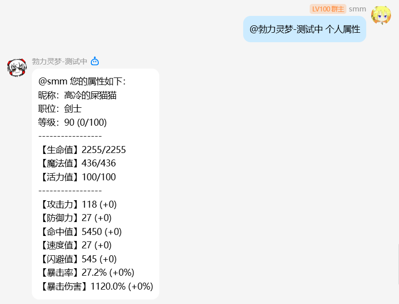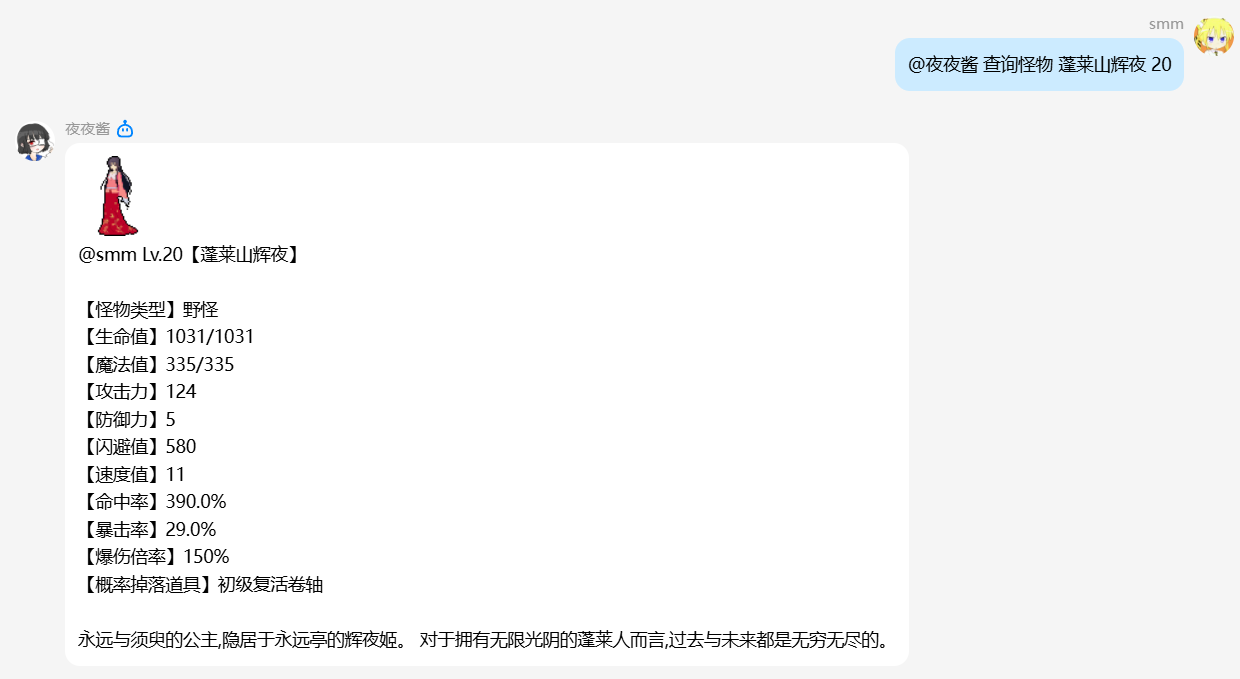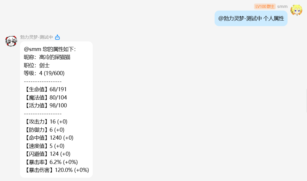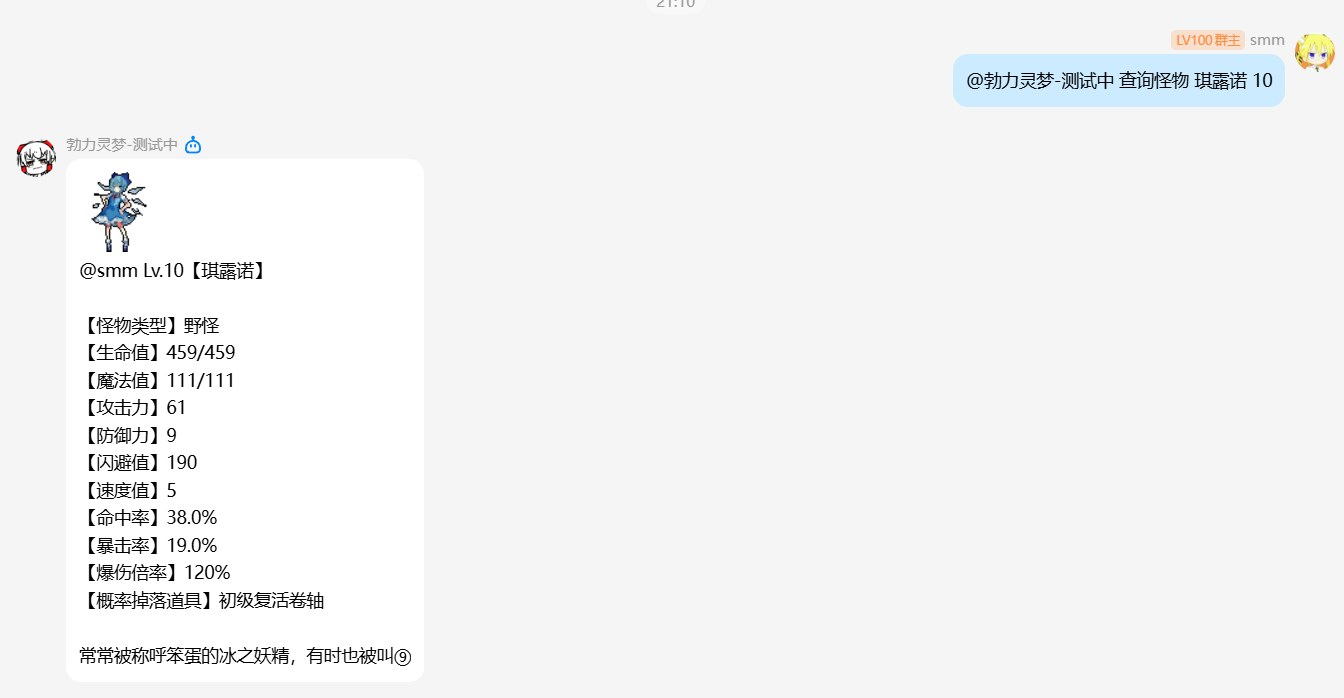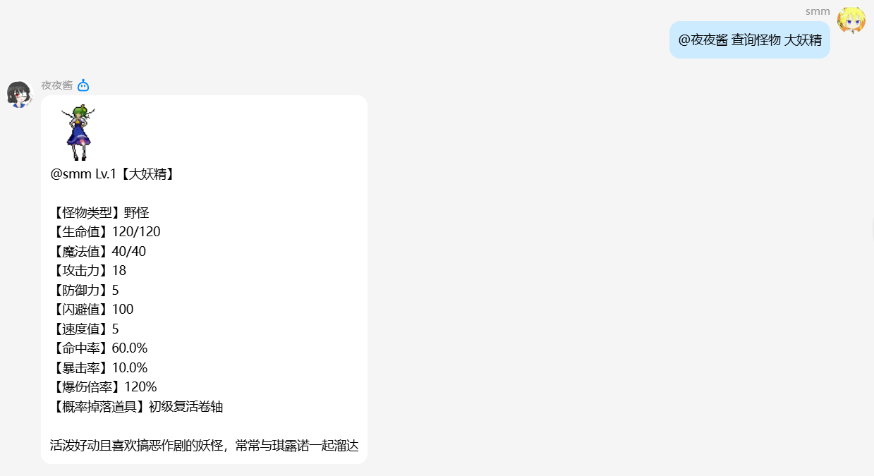 当地图中存在怪物时,可发送 /打怪遇敌 进行战斗,也可以指定单个 打怪遇敌 的对象
