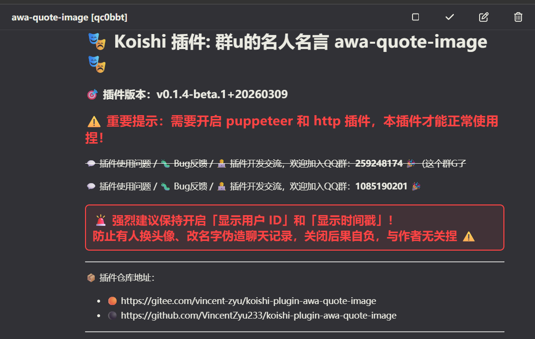 48bb999 (HEAD -> master, origin/master, origin/HEAD, github/master) feat: 新增 showUserId/showTimestamp 配置项 & 更新QQ群号 & 防伪造警告提示 & bump 0.1.5-beta.1
