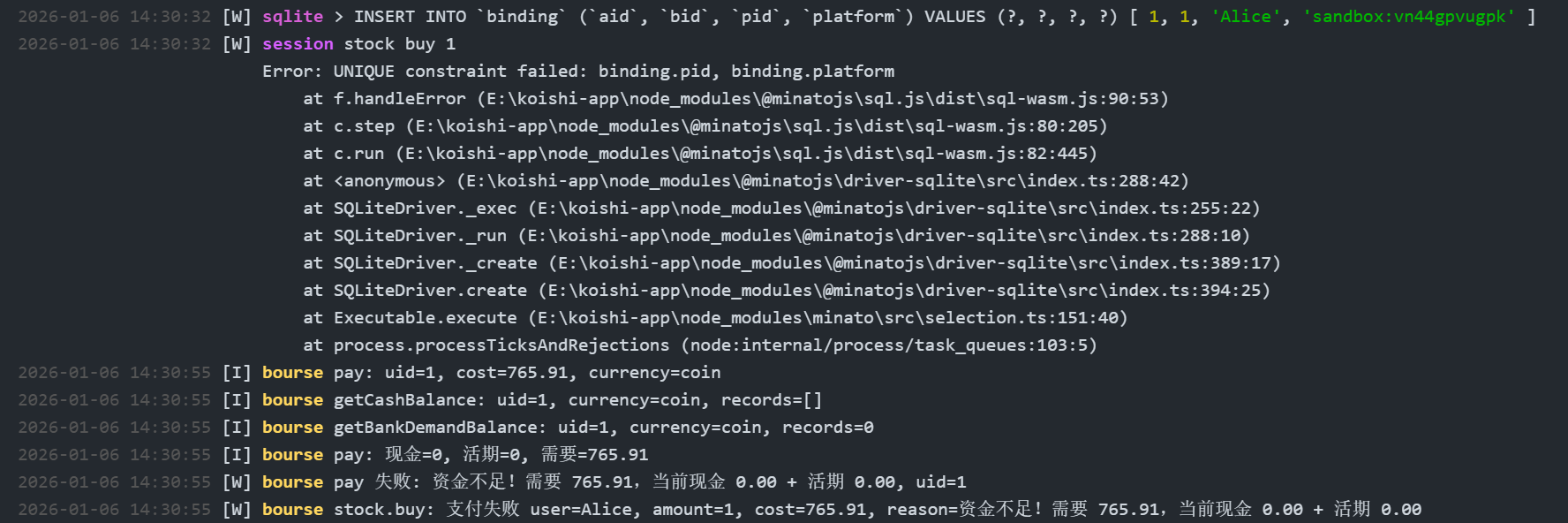 不出意外的话,如果你把数据库的user表删掉,然后重启koishi,立即触发这个指令,就能复现这个问题