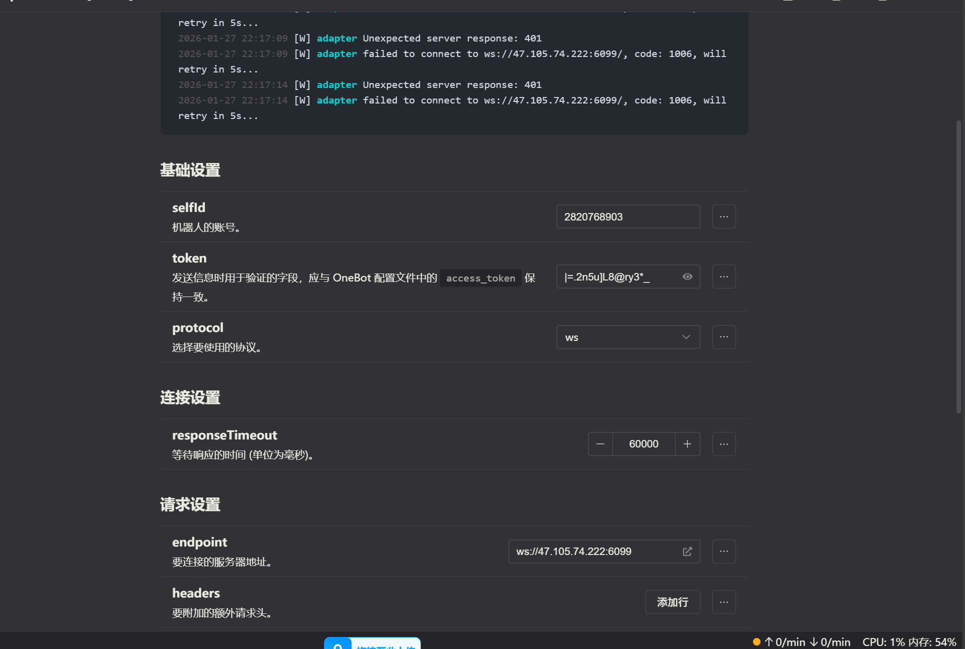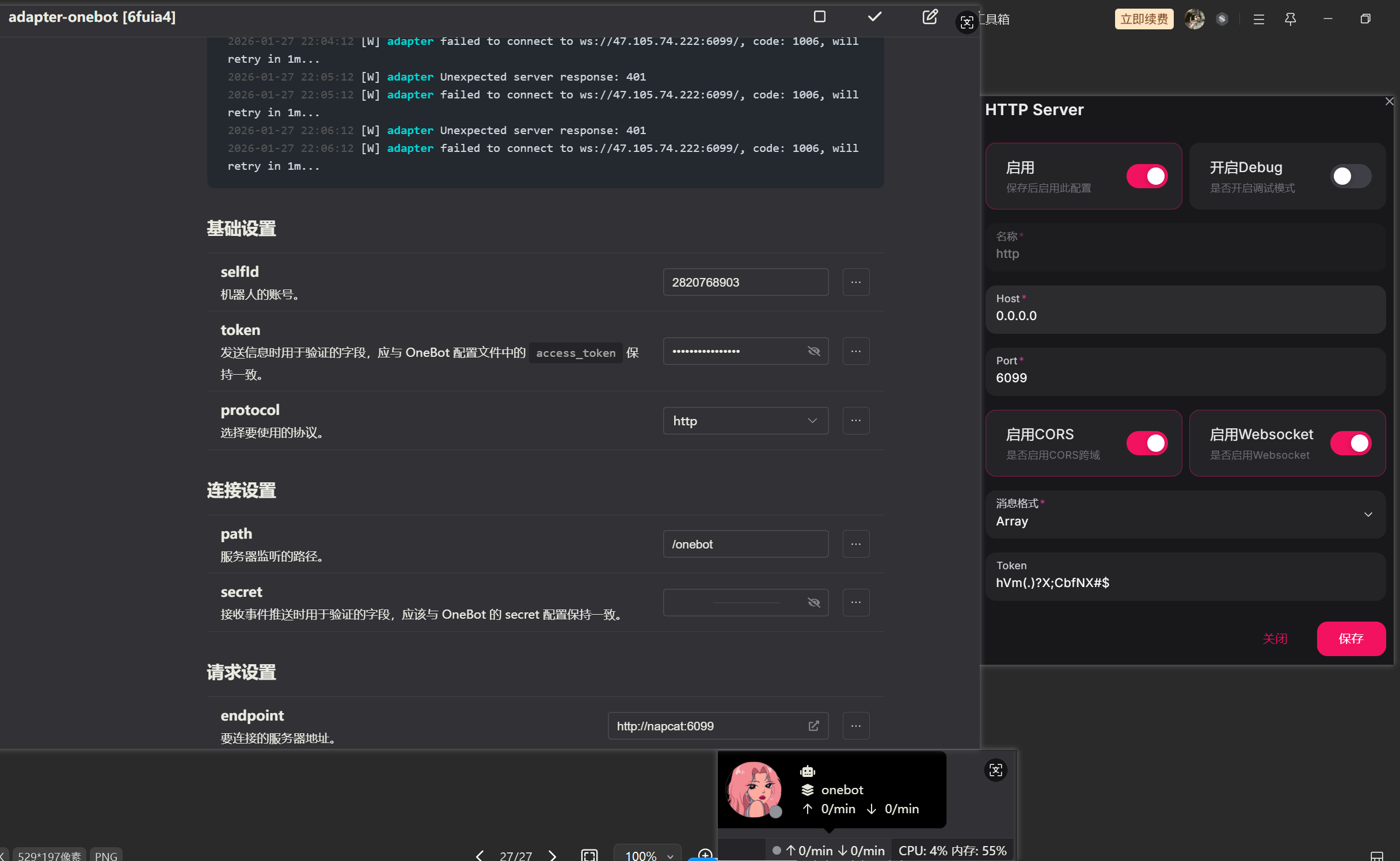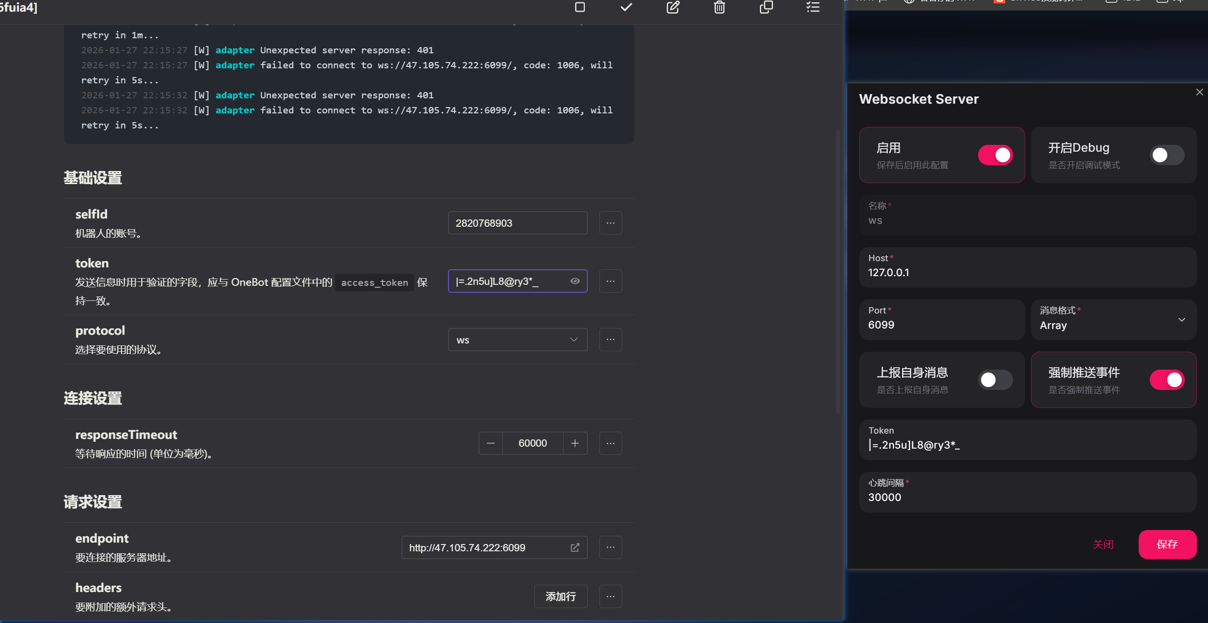 第一.端口号不对,看图你用的应该是napcat把?他的端的ws端口不是6099默认应该是3001你不要改成6099这是你web的端口 第二,看着你这是云服务器记得云服务器的安全组里放行3001端口 第三,如果是docker的话建议用docker的内部ip 3001那个如果你这2个容器都在一个bridge网络里的话