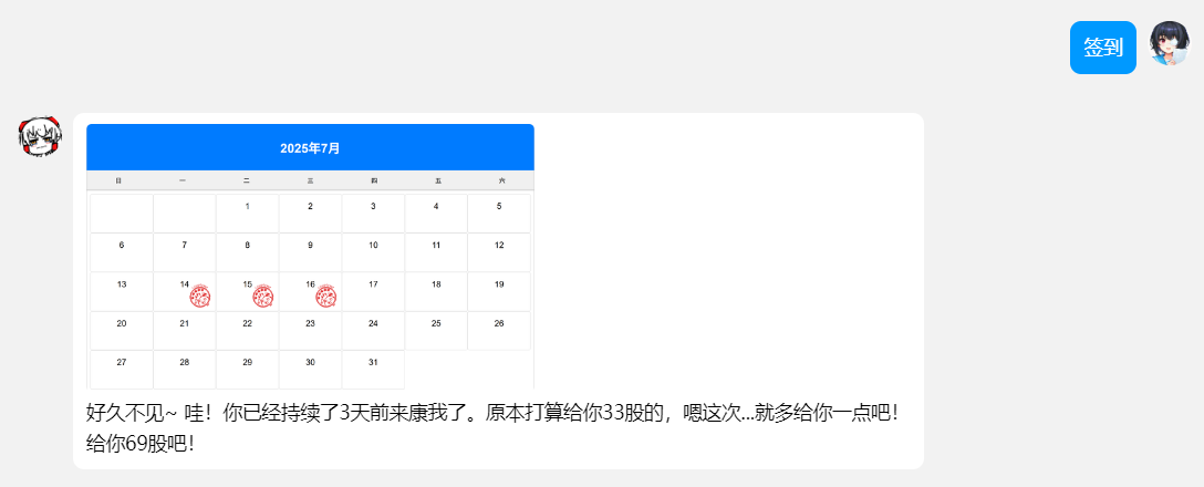 %calendar%%sayHi%哇!你已经持续了%day%天前来康我了。原本打算给你%points%的,嗯这次…就多给你一点吧!%br%给你%all_points%吧!
