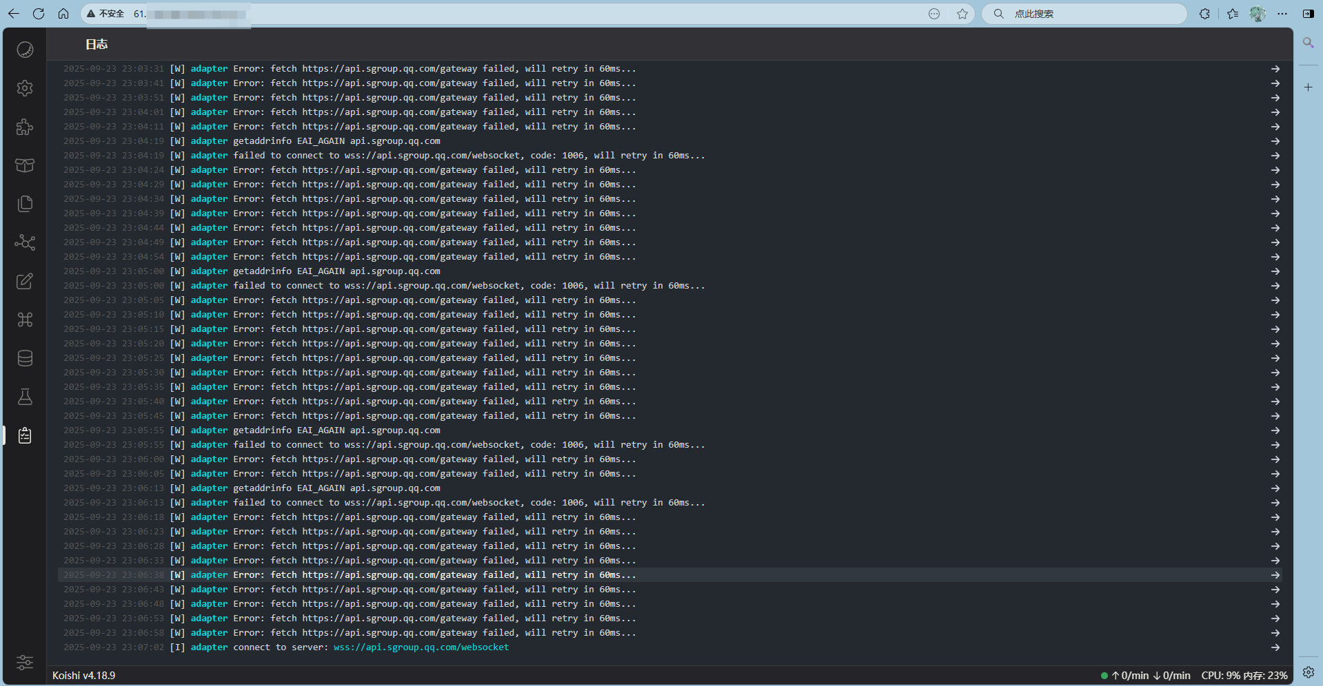 我的adapter-qq在运行成功链接后,可以正常链接qq服务器收发,但是在一段时间后(没有任何操作)就会报错关闭,求求大佬们帮我解答一下吧qwq